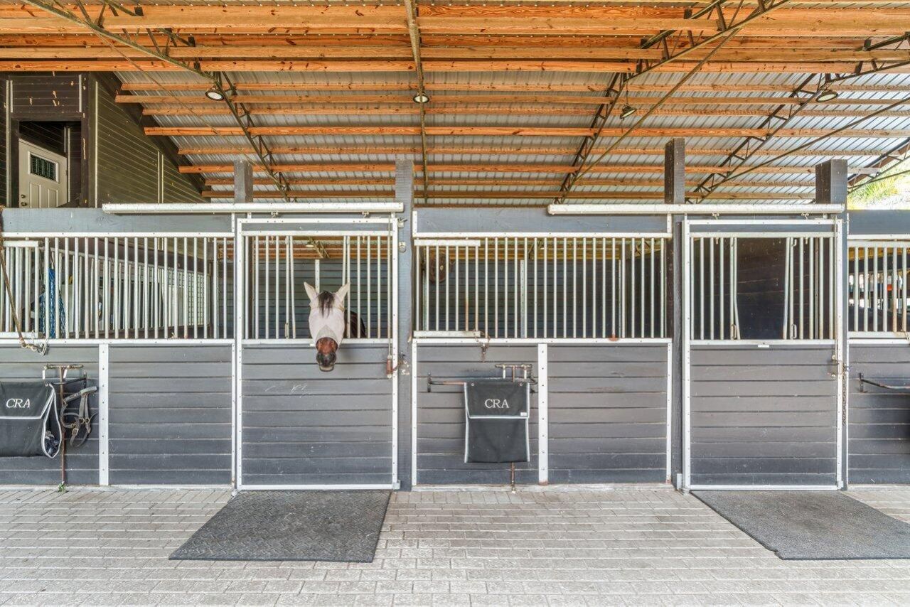 Barn with studio lounge, tack room, feed room, 4 covered wash stalls w/fans, RV hookups. Ring is 175 x 110 w/large irrigation jets, 6 irrigated paddocks. Hacking distance to 365 acre preserve at the end of the road as well as all Wellington bridle paths and WEF.