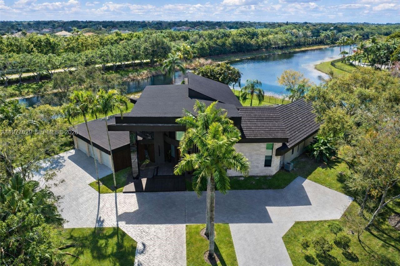 Rare offering in Windmill Ranch Estates featuring one of the largest waterfront cul-de-sac point lots currently available in the community. This exceptional property sits on a private 44,219 SF acre-plus lot with water views on both sides and remarkable privacy.The unique contemporary residence offers 5 bedrooms, 5.5 bathrooms, and a private office that can easily serve as a sixth bedroom. The home showcases dramatic 28-foot ceilings, expansive glass walls, and a striking architectural design fi...Rare offering in Windmill Ranch Estates featuring one of the largest waterfront cul-de-sac point lots currently available in the community. This exceptional property sits on a private 44,219 SF acre-plus lot with water views on both sides and remarkable privacy.The unique contemporary residence offers 5 bedrooms, 5.5 bathrooms, and a private office that can easily serve as a sixth bedroom. The home showcases dramatic 28-foot ceilings, expansive glass walls, and a striking architectural design filled with natural light.Architectural highlights include a spectacular two-story library with a spiral staircase, a grand sweeping staircase, spacious living areas, and a gourmet kitchen with quartz countertops and stainless steel appliances.The primary suite features dual bathrooms and oversized walk-in closets. Outdoor spaces include a pool, multiple terraces, and a summer kitchen, ideal for entertaining while enjoying beautiful sunset and water views.